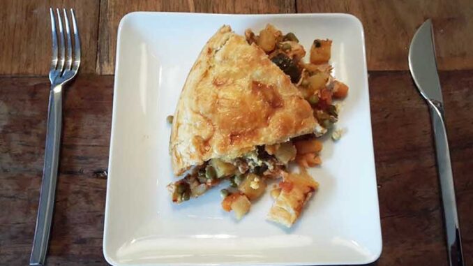 Kook de kipfilet tot ze gaar is en laat afkoelen. Trek hierna de kip helemaal uit elkaar tot je allemaal mooie draadstukken hebt. Doperwten/wortelen in een vergiet laten uitlekken en de worteltjes klein snijden. Doe een stuk boter in de pan van zo’n 40 gr. en fruit hierin de ui, knoflook en de tomatenpuree. Voeg de geplozen kip toe en bak mee. Doe nu de doperwten/worteltjes, piccalilly, kappertjes erbij en breng op smaak met de nootmuskaat, zwarte peper, de suiker en verkruimel het bouillonblokje erboven. Bakblik bodem bekleden met bakpapier en de randen insmeren met boter. Bekleed rondom met bladerdeeg, doe de groente/kip vulling op in het bakblik en leg bovenop het mengsel allemaal plakjes hardgekookt ei. Bedek met de rest van de vulling met het bladerdeeg en bestrijk met een geklutst ei om de bovenkant mooi goudbruin te bakken. Bak de pastei in een voorverwarmde oven op 180C. in ca. 40 tot 45 minuten.