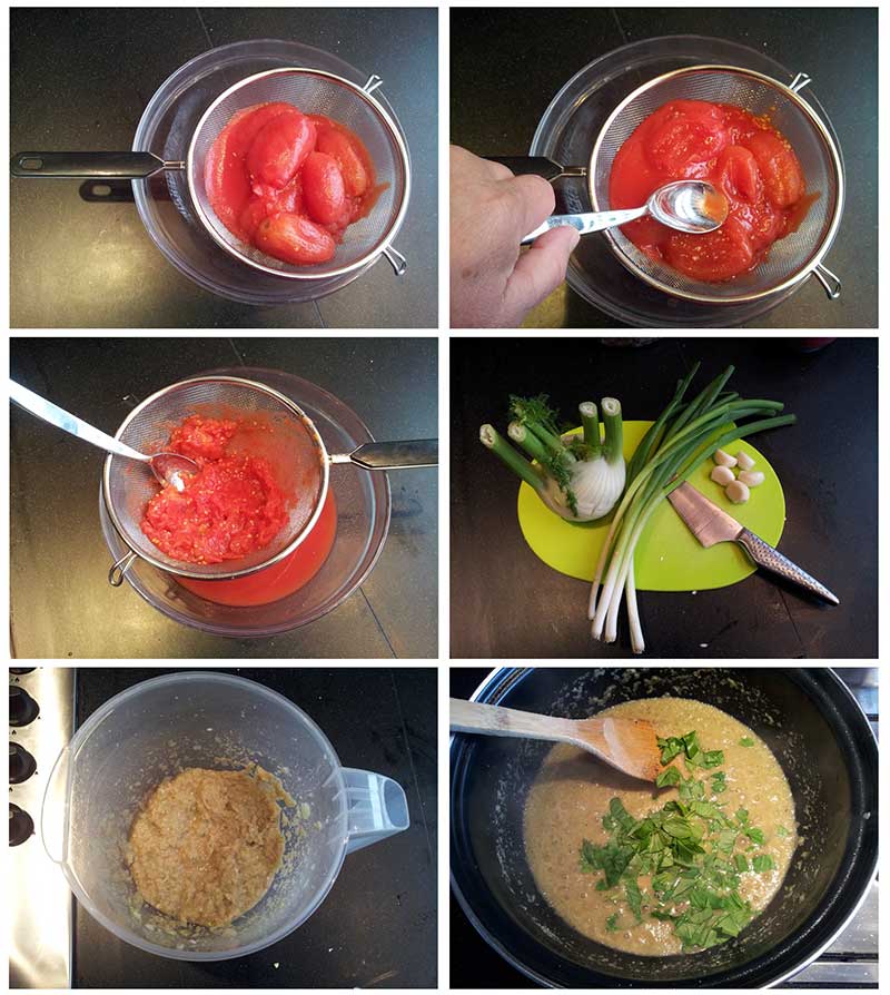 Hak de venkel, ansjovis en de bosuitjes met een keukenmachine fijn en fruit dit met twee eetlepels olijfolie in een grote braadpan op hoog vuur onder regelmatig roeren. Knijp met een knoflookpers de knoflook erboven uit en voeg de witte wijn toe. Laat de witte wijn inkoken, voeg de pasata en 350 ml. kokend water toe. Hak de verse basilicumblaadjes grof en doe ook deze in de pan, voeg zout & peper naar smaak toe en laat het geheel even pruttelen.