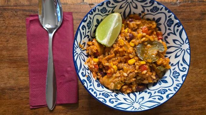 Knijp het sap van 1 limoen over de kip en rijst. Haal de kip uit de pan of schuif hem opzij en maak de rijst los. Serveer, eventueel gegarneerd met extra limoenpartjes en plakjes jalapeño. Zure room past er ook goed bij, of een klodder guacamole of avocadosaus!
