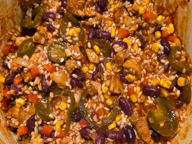 Voeg de rijst, de kippenbouillon, tomaten passata, maïs, bonen toe en roer alles goed door elkaar. doe nu ook de kip terug in de pan en zet met de deksel erop 25-30 minuten in de voorverwarmde oven.