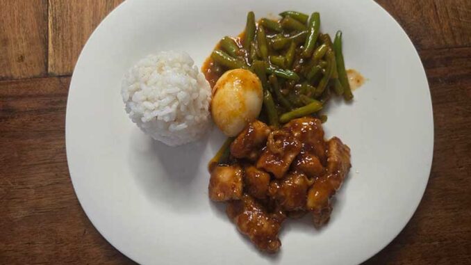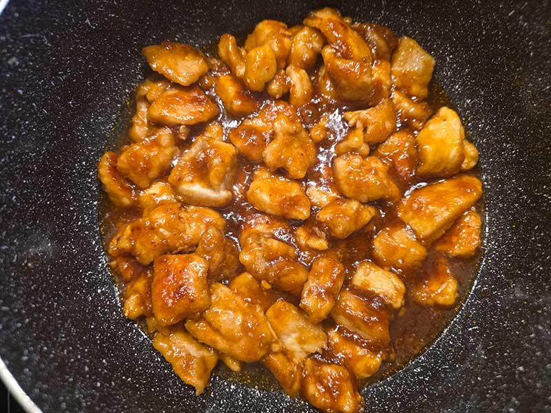 Maak een papjes van 1 el. maïzena en een el. water en schenk dit al roerend door de kip tot deze glanzend en de suas dikker wordt. Serveer met witte rijst