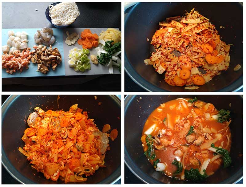 Voeg de bamboescheuten, ui en wortel toe en roerbak tot de groenten zacht zijn. Voeg de zeevruchten en de in blokjes gesneden kabeljauwfilet met de blaadjes van de paksoi toe en doe de deksel ca. 30 sec. op de pan. Voeg nu de bouillon toe en breng aan de kook, zet het vuur lager en breng op smaak met zout & peper en de sojasaus. Laat 3 minuten sudderen. Kook de udon noedels, giet af en spoel af met koud water. Doe in iedere kom wat noedels en schenk de soep erop.