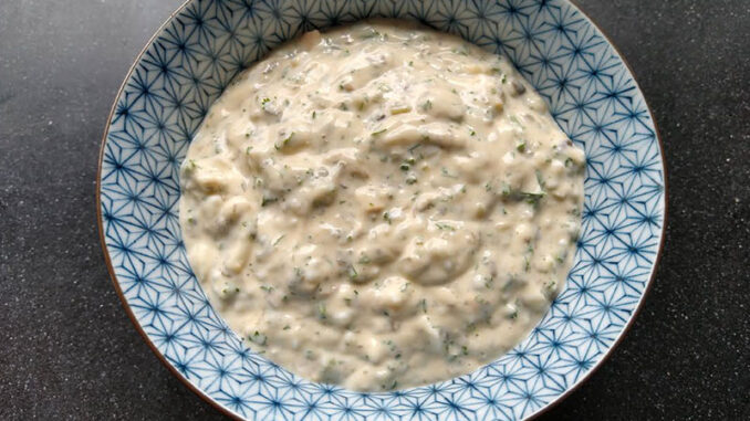 Kook de drie eieren in ca. 10 minuten hard en laat ze in koud water `schrikken’. Prak de eieren met een vork zo fijn mogelijk. Pluk de peterselie en hak fijn. Snijd de bieslook fijn en hak de kappertjes en de augurk ook zo fijn mogelijk. Doe vervolgens de halvanaise, de yoghurt en de rest van de ingrediënten in een kom en meng goed. Breng op smaak met zout & peper en enkele druppels citroensap.
