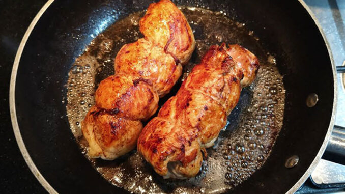 Sla de kipfilets plat met een vleesbijl of rol de kip plat met een deegroller. De kip moet plat zijn om makkelijk op te kunnen rollen. Bestrooi met verse peper en zeezout naar smaak en leg de blaadjes salie er op en hierop de plakjes Prosciutto. Rol de kip op met en zet de Kip vast met een cocktailprikker. Verwarm de koekenpan en als de boter en olijfolie gloeiend heet zijn, doe je de Kip in de pan. Bak de kip hard aan, zodat deze gelijk mooi bruin wordt. Zodra je de kip omdraait, zet je het vuur op zacht. Blus de Kip af met de Italiaanse droge witte wijn. In ongeveer 10 tot 12 minuten is de Kip klaar. Laat de Kip onder een stukje alufolie rusten (dit duurt net zo lang als het bakken). Tot slot snij je de kip in plakken van ongeveer twee centimeter.