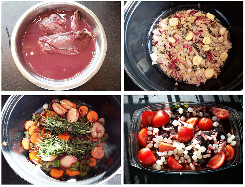Laat de hazenbouten 24 uur in de (koelkast) rode wijn staan. Snipper de ui, snijd de knoflook, de selderij en de wortel in plakjes en halveer de sjalotten. Braad de ui tot ze glazig is en voeg de knoflook toe, gooi het wijnvocht weg en dep de bouten droog, bestrooi ze met zout & peper en braad rondom mooi bruin, haal uit de pan en zet weg. Bak nu zo’n 3 minuten de groenten en de kruiden in het braadvet. Meng het wildfond met de port en de wijn en blus de groente af. Doe alles over in een ovenschaal, leg hierin de hazenbouten en verdeel de zilveruitjes, de spekblokjes en de tomaten er over. Zet, met de deksel er op, in de oven en laat 4 uur stoven op een temperatuur van 150°C – de oven NIET voorverwarmen!