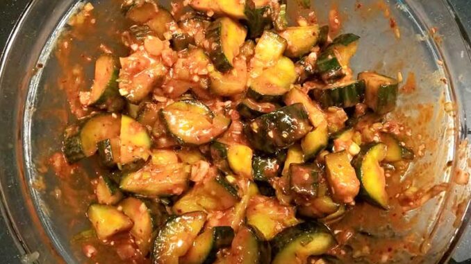 Snij de komkommer in blokjes en leg in een vergiet, bestrooi met zeezout en mix goed zodat het zout overal zit. Laat 30 minuten staan. Doe de komkommer in een vochtige keukendoek en knijp er voorzichtig zoveel mogelijk vocht uit. Doe de lente-ui in een grote kom en alle verdere ingrediënten toe, mix goed tot er een mooie marinade ontstaat. Meng de marinade met de komkommer en zet weg in de koelkast voor een paar uur tot een dag.