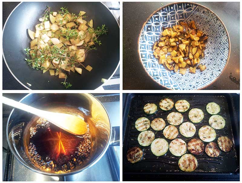 Meng de plakken courgette, olie, zeezout versgemalen peper en fijngehakte rozemarijn in een kom, dek af. en laat marineren. Rooster de paprika’s boven vuur of gebruik een gasbrander, als de paprika’s zwart worden kan je eenvoudig het velletje verwijderen. Snij in plakken en leg apart. Verhit 3 el. olie in een pan en bak de ui en knoflook in ca. 4 min., voeg de tomaat, tijmblaadjes, rest van de olie toe en laat alles ca. 40 min. zachtjes pruttelen. roer zo nu en dan even om aanbranden te voorkomen. Kook de balsamico in tot er ongeveer 1 el. overblijft (zo’n 3 min.) en voeg de balsamico toe aan het tomatenmengsel en breng op smaak met zout en peper. Snij de aubergine in kleine blokjes en roerbak deze samen met de knoflook en de takjes tijm in olijfolie, verwijder na het roerbakken de takjes! Haal de plakjes courgette uit de olie en laat in een zeef uitlekken, schud de overtollige olie er nog vanaf en bak de courgette nu aan weerskanten in een grillpan tot ze mooie bruine strepen krijgen. Leg de helft van de courgette in een laag in een ovenschaal en schep hierop de helft van de aubergine, bedek met reepjes paprika en doe hierop de helft van het tomatenmengsel. Herhaal dit met de rest van de ingrediënten, bestrooi met wat fijngehakte rozemarijn en bak dit in de oven ca. 20 min. Haal de schaal uit de oven en bestrooi met Parmezaanse kaas. Zet de grill op de hoogste stand en laat het in ca. 2 a 3 min. goudbruin worden.